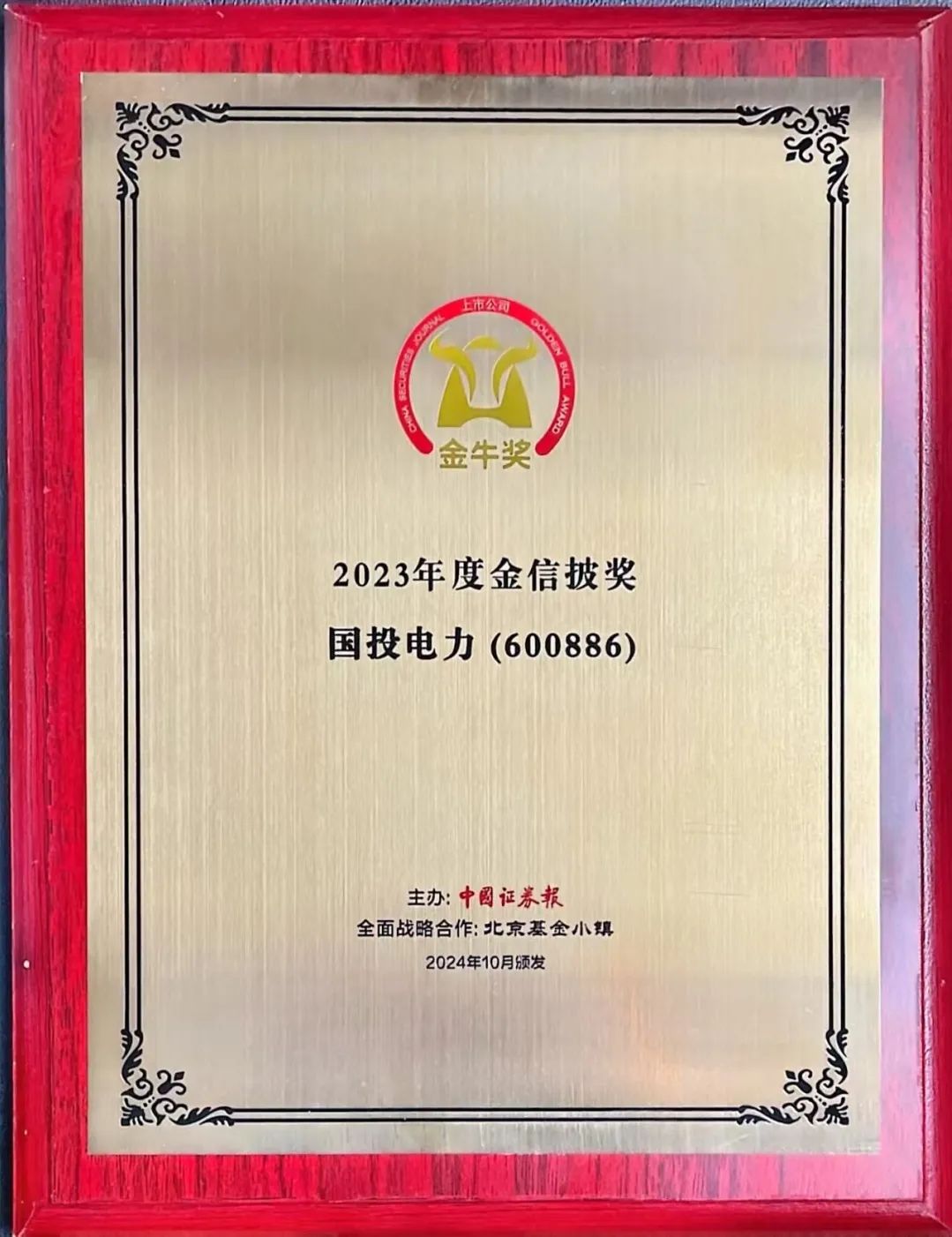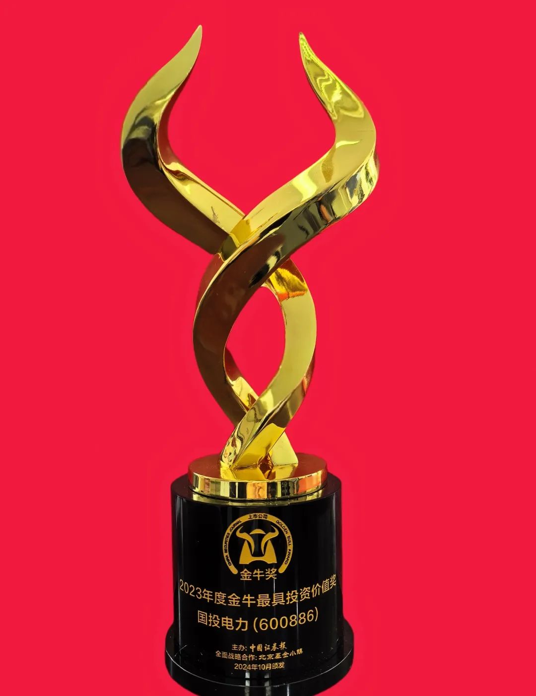 近日,在2024上市公司高质量发展论坛暨第二十六届上市公司金牛奖颁奖典礼上,国投电力以卓越的市场表现和公司治理,荣获“最具投资价值奖”和“金信披奖”两项大奖。