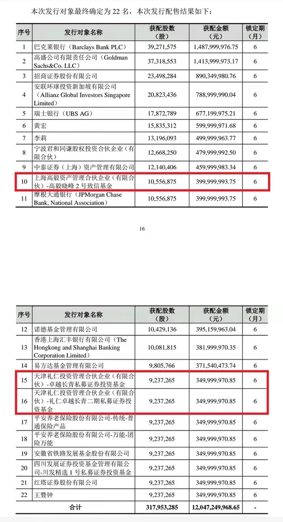 共有22 家机构及个人成功获配此次定增,多家QDII机构现身定增名单,其中,巴克莱银行、高盛、安联环球投资新加坡有限公司三家机构分别获配14.88亿元、14.14亿元、7.89亿元,在22家机构中获配金额居前。