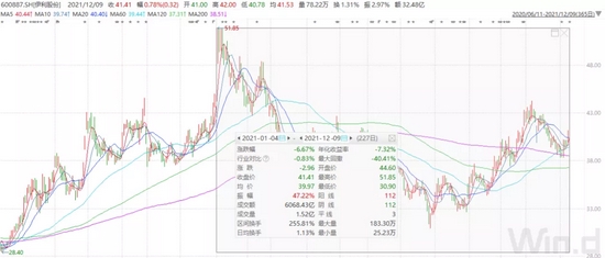 Wind数据显示,截止12月9日收盘,伊利股份报收41.41元,市值超2500亿元。年内股价仍下跌6.67%。