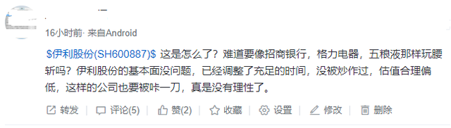 但随着伊利股份突然大跌6.77%后,最后的“茅族”成员也走下神坛了。在网上,有股民写道:“这是怎么了?难道要像招商银行,格力电器,五粮液那样玩腰斩吗?伊利股份的基本面没问题,已经调整了充足的时间,没被炒作过,估值合理偏低,这样的公司也要被咔一刀,真是没有理性了。”