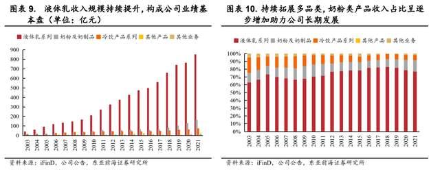 从收入规模来看,公司液态乳业务历年来持续增加,2000-2021年营收由14.32亿元增加至849.11 亿元,年均复合增速达 21.46%。