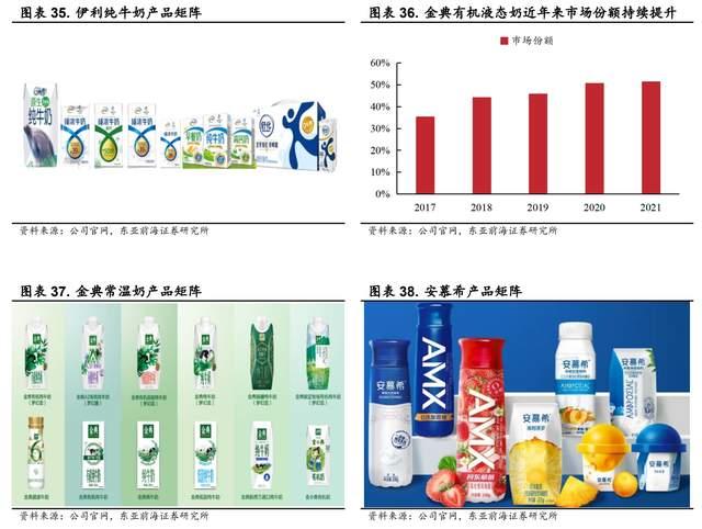 (2)产品营养上:不断提升营养价值,满足消费者对于健康的极致追求。2022 年公司推出金典娟姗有机纯牛奶,其中原生乳蛋白含量从 3.5g/100ml 提升至 4.0g/100ml,高于国家标准 34%,每瓶蛋白含量约等于 1.4 个鸡蛋的蛋白含量,充分满足消费者对高端液态奶的需求。产品具有原生高蛋白、原生高倍钙、浓郁醇香的口感等鲜明特点,有望在高端有机奶市场上长远发展。