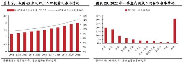从政策层面看,我国已将积极应对老龄化上升为国家战略;同时中老年人对健康的诉求进一步加大,根据 CBNDate 消费大数据,2020 年 3 月中老年奶粉销量同比提升 142%;根据尼尔森零研数据,2021 年成人奶粉市场规模较 2020 年同比增加 10%以上。消费者对成人奶粉的认知和接受度逐渐提高,成人奶粉有望迎来广阔发展空间。