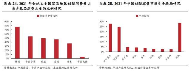 从全球奶酪消费量来看,2021 年我国大陆奶酪消费量占大陆乳品消费总量的比例仅 4.02%,远低于饮食习惯相近的韩国(占比 76.8%),国内奶酪产品市场空间广阔。