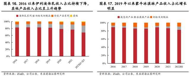 从二者历年收入构成来看,2016-2022 年前三季度伊利液体乳收入占比由 83.07%下降至 68.56%,而奶粉及奶制品收入占比由 9.15%大幅提升至 20.03%,冷饮产品表现较为稳健,冷饮产品收入占比由 2019 年的 6.29%逐步提升至 2022 年前三季度的 9.84%;与此同时,蒙牛液态奶收入占比由 2016 年的 89.44%下降至 2022H1 的 83.12%(下降幅度略低于伊利),2019-2022H1 冰淇淋产品收入占比由 3.24%提升至 8.18%,奶粉及其他奶制品收入占比自 2020 年疫情后也呈现增长趋势。