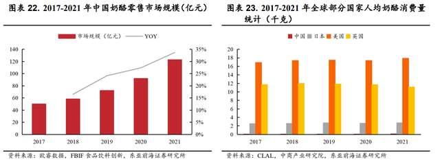根据统计,2017-2021 年中国奶酪零售市场规模由 49.9 亿元增加至 122.7 亿元,年均复合增速达 25.22%,国内奶酪市场规模呈逐渐增加趋势。
