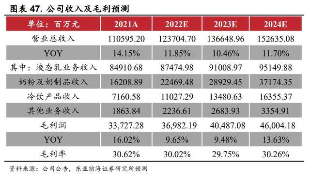 1)液态乳业务:结合 2022 年三季报液态乳动销趋缓情况,我们预计 2022-2024 年公司液态乳的销量增速分别为 1.00%/2.00%/2.50%,单价增速分别为 2.00%/2.00%/2.00%,对应收入分别为 874.75/910.09/951.50 亿元,收入同比增速分别为 3.02%/4.04%/4.55%。