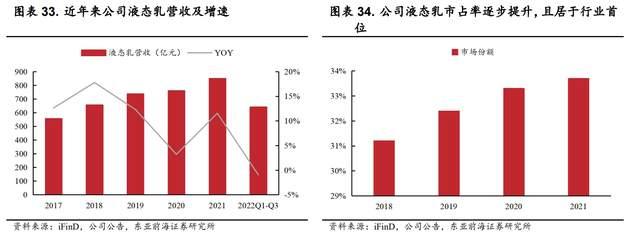 根据尼尔森零售调研数据,2018-2021 年公司液态乳零售额市场份额由 31.2%提升至 33.7%,2022H1 较去年同期提高了 0.1pct,稳居行业第一。