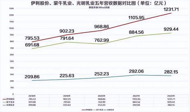 2022年对于乳业来讲,考验重重,尤其是社交、节日礼赠场景的减少,对液态奶行业造成一定冲击。在这样的行业拐弯赛道,通过现代奶产业集群长远布局、产业链技术的高转化率、品类结构的全面均衡发展,伊利直面挑战把握机遇实现弯道加速,持续拉大行业领先身位,营收超蒙牛乳业306亿元,更比蒙牛与光明的营收之和还多出20亿元。