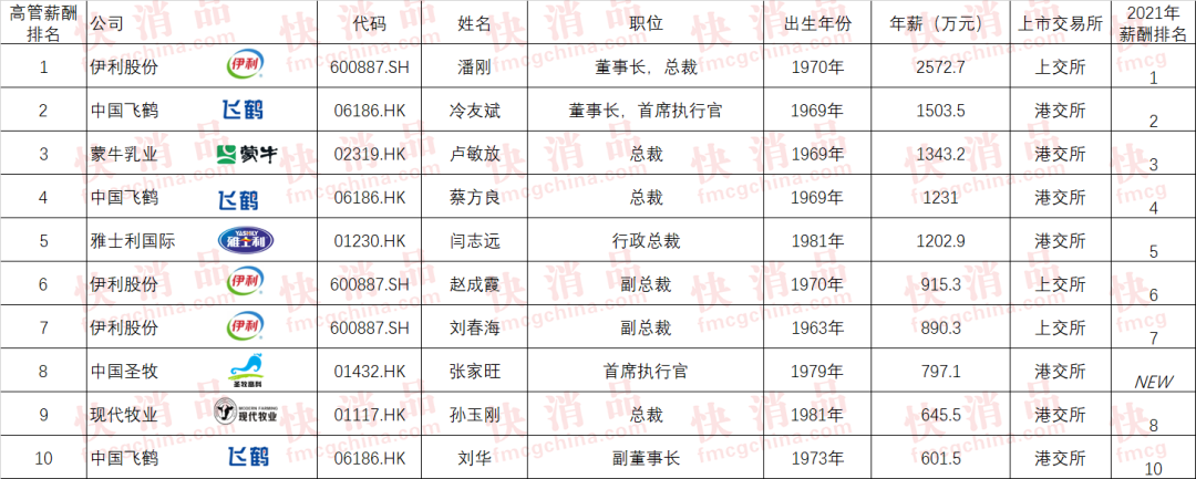 随着各上市公司2022年业绩的陆续公布,公司高管们的薪酬情况也揭开了面纱。东方快消品中心同行业领先的全媒体《快消品(网)》汇总了在上海、深圳、香港、北京上市的350余家大快消相关公司高管的年薪总额并排序,选取年薪前100位高管,独家公布“2022大快消上市公司TOP100高薪高管”。此次,《快消品》带来“2022年中国乳业上市公司TOP20高薪高管”。