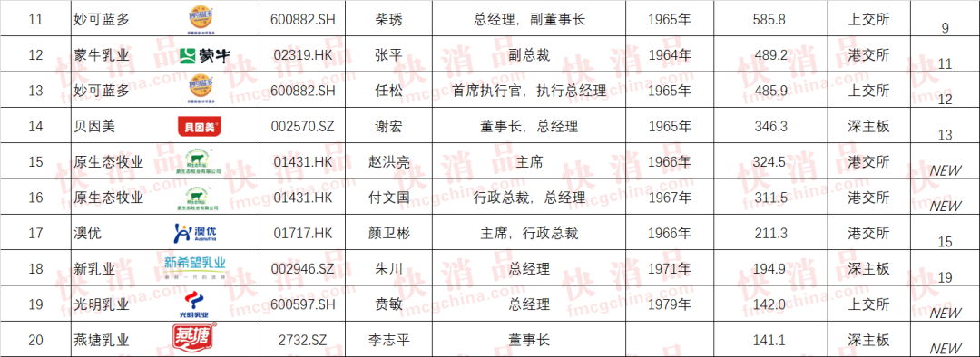 2022年中国乳业上市公司TOP20高薪高管