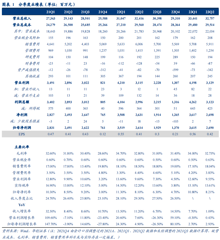 伊利股份发布2023年中报。23H1公司实现总营收662.0亿,同比+4.3%,归母净利润63.1亿,同比+2.8%,扣非归母净利58.0亿,同比-1.5%。单Q2总营收327.6亿,同比+1.05%,归母净利26.9亿,同比+2.9%,扣非归母净利24.8亿,同比-4.5%。