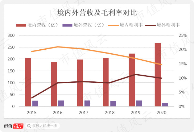 从境内外营收对比来看,公司境内营收占据主导地位,2020年占95%。不仅如此,境内营收的毛利率虽然处在下降通道,但是2020年仍然领先近5个百分点。