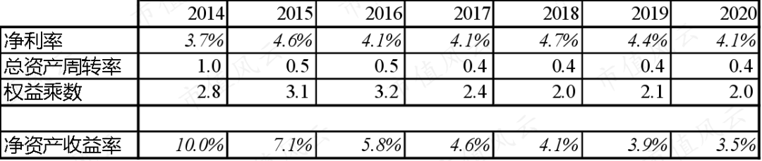 简单做一个杜邦分析,可以看出公司的总资产周转率偏低,结合较低的净利率以及下降的权益乘数,最终净资产收益率表现并不理想。