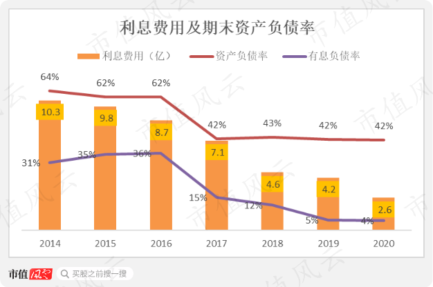 相对应的,公司的利息费用也持续下降,从2014年的10.3亿降至2020年的2.6亿,降幅显著。