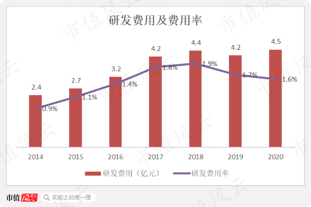 而单看公司的研发费用率可能会让人大跌眼镜,因为公司的研发费用率几乎从未超过2%:一家2020年营收近300亿的公司,研发费用只有区区4.5亿?