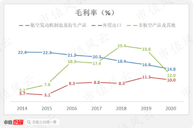 经过几年的业务调整,一方面非航空产品及其他业务营收大幅下降,2014-20年间从87亿降至6亿;另一方面毛利率近年来有持续上升的势头。