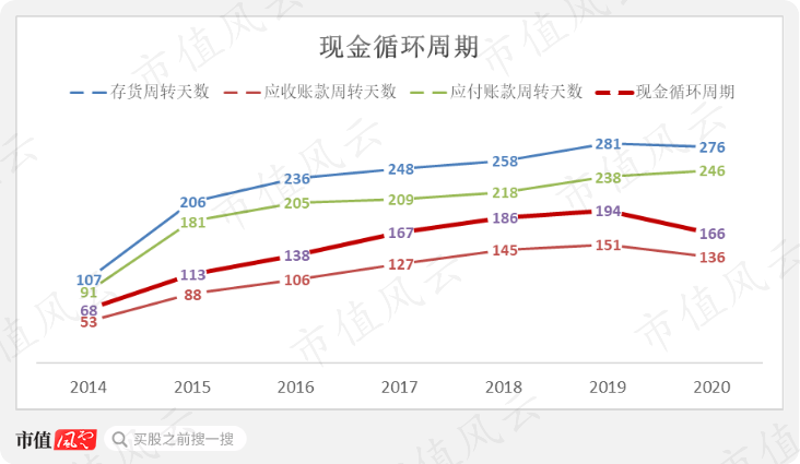 我们通过现金循环周期来测算公司的经营效率。可以看出,公司这项指标并不理想,完成一轮“购存销”需要沉淀近5个多月的自有资金,这与公司所在的行业特性息息相关。