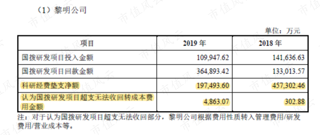 以三家核心子公司中相关规模最大的黎明公司为例,截止2019年末,科研经费垫支净额接近20亿,但是被认定为超支而无法收回转成本费用的金额为4863万,占比仅2.4%。