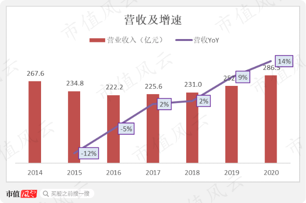 最近的2020年营收286亿元,同比增14%,近年来增速有加快迹象。