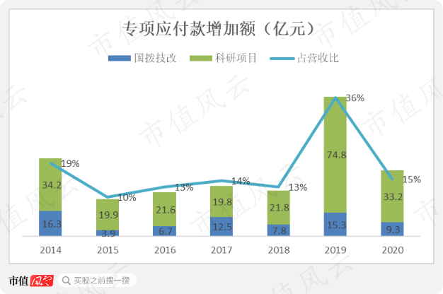 公司专项预付款包括国拨技改以及科研项目两类。还是以2020年为例,首先,这个规模是相当可观的,进出都是数亿、数十亿的量。
