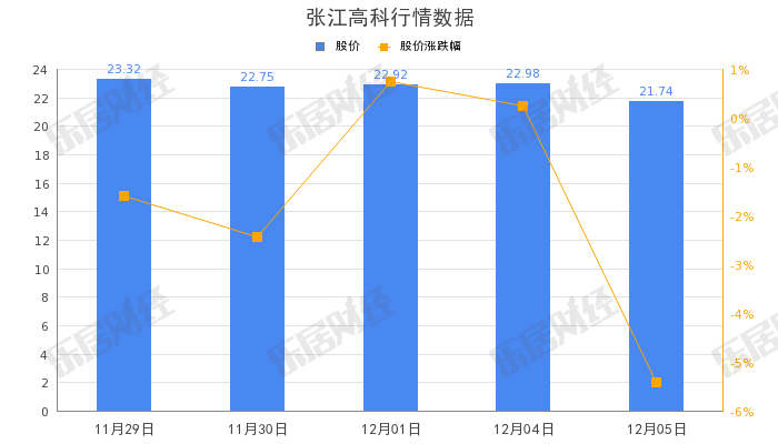 截至12月05日,张江高科(600895.SH)股价收盘报22.98元,跌5.4%,总市值336.69亿元。