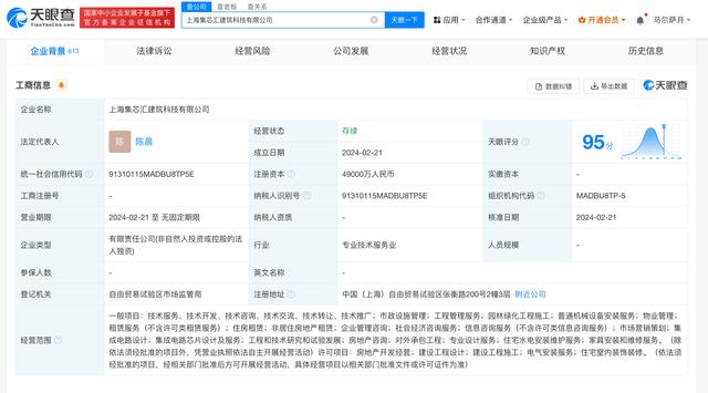 此外,上海集芯汇建筑科技有限公司也于同日成立,注册资本4.9亿人民币,法定代表人也为陈晨。股权全景穿透图显示,该公司由张江高科(600895)旗下上海张江集成电路产业区开发有限公司全资持股。