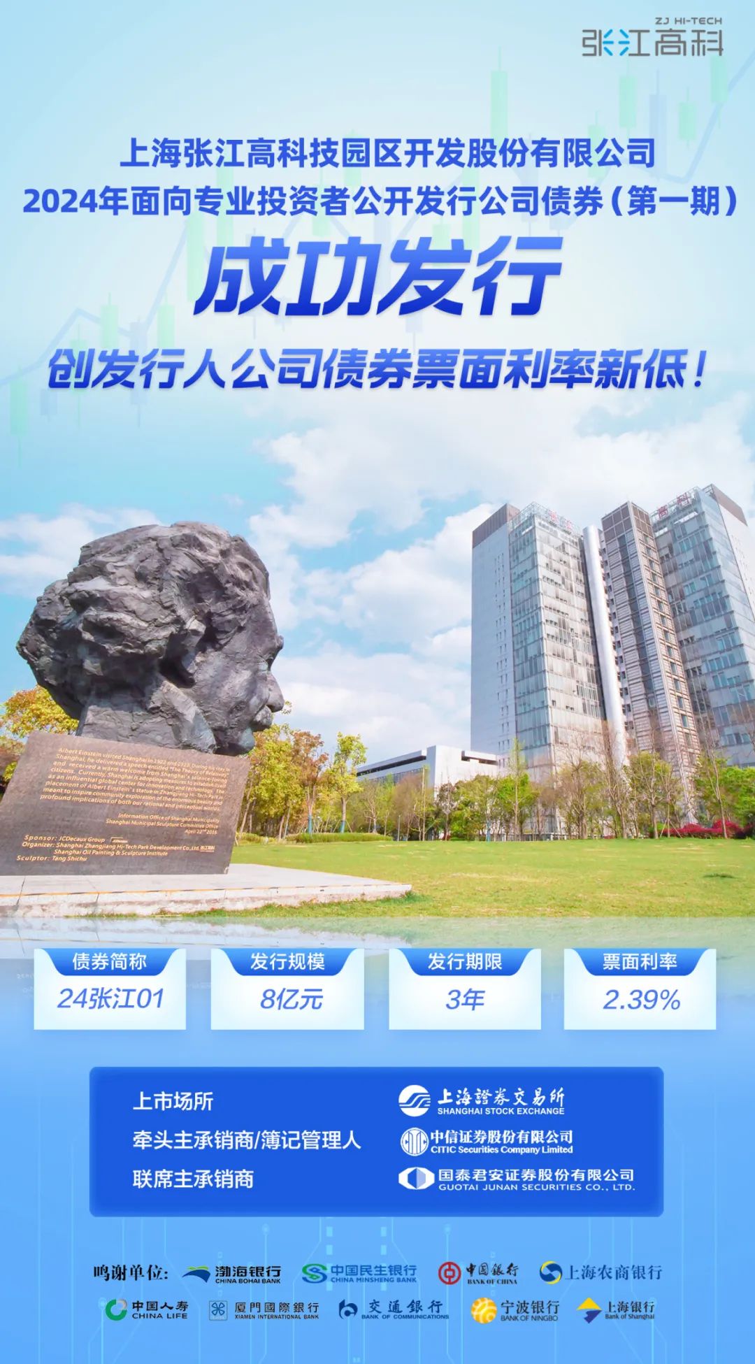 5月8日,张江高科成功发行“上海张江高科技园区开发股份有限公司2024年度第一期公司债券”。发行期限三年,总金额8亿元,最终发行利率2.39%,该发行利率创造了张江高科三年期债券的历史最低水平,为公司中长期可持续发展奠定了良好基础,也大幅降低了公司的融资成本。与此同时,本次发行的公司债券得到了市场的广泛认可,投资人积极参与,全场投资倍数4.92倍。