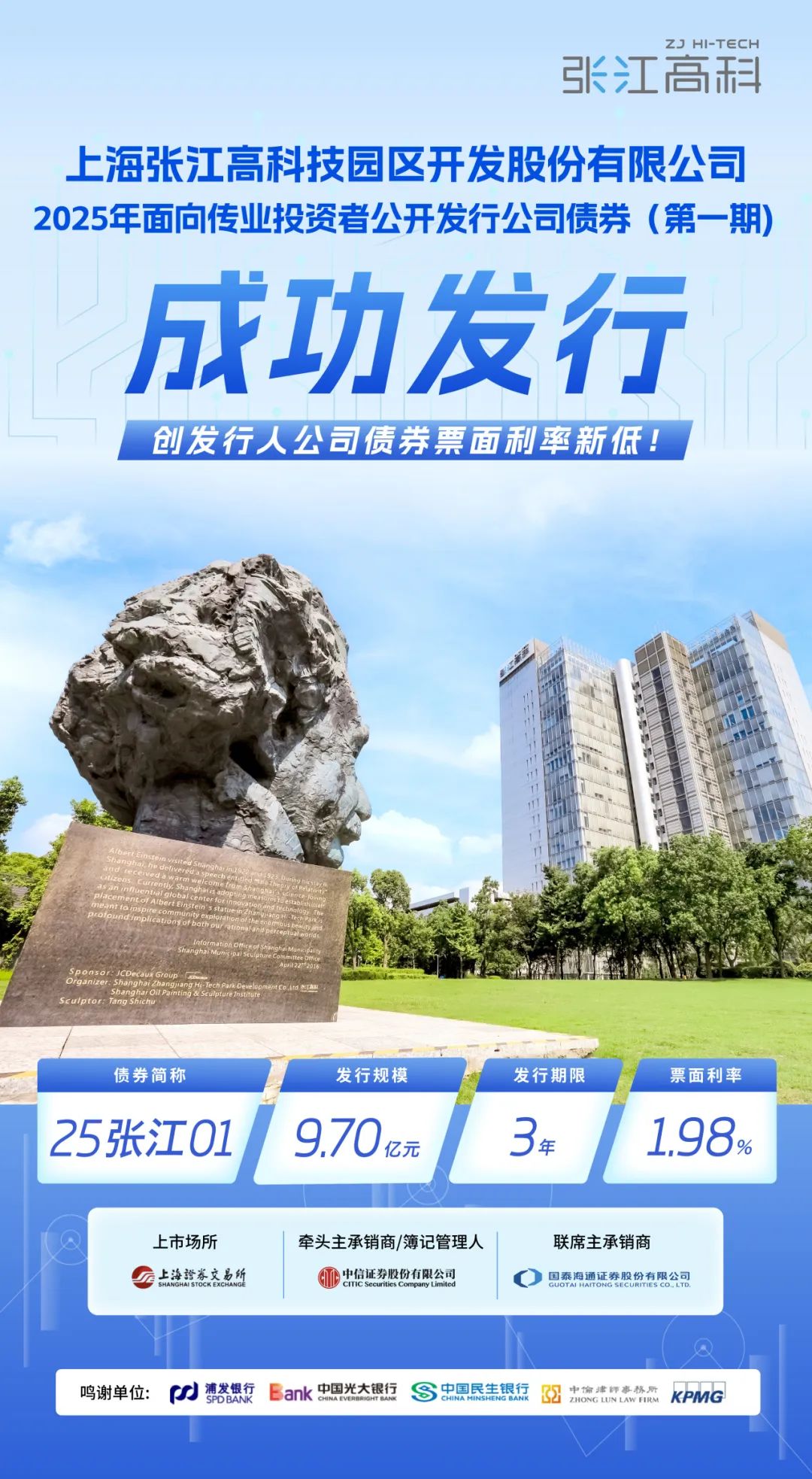 近日,上海张江高科技园区开发股份有限公司(简称“张江高科”)发行2025年第一期公司债券。此次债券期限3年,发行总金额达9.7亿元,最终票面利率1.98%,不仅低于市场预期,更刷新了公司同期限发行利率历史最低纪录。此次债券发行获得市场高度认可,全场投资倍数高达4.06倍,众多投资者踊跃认购,体现了张江高科在资本市场的强劲吸引力与良好信誉。