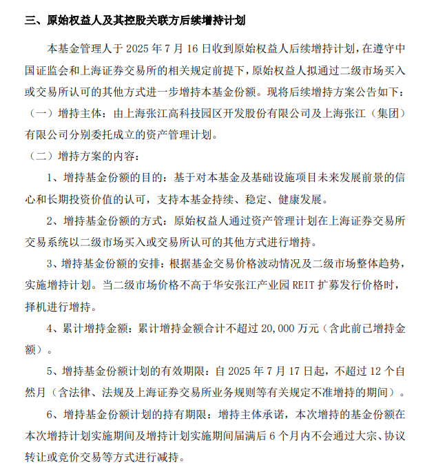 本次增持计划自7月17日起,不超过12个自然月内,根据基金交易价格波动情况及二级市场整体趋势,当二级市场价格不高于华安张江产业园REIT扩募发行价格时,择机进行增持,累计增持金额合计不超过2亿元(含此前已增持金额)。