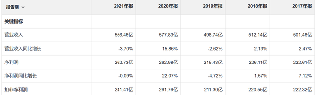 长江电力的业绩十分稳定,长期缓慢增长,近5年营业收入从500亿增长到550亿,净利润从222亿增长到262亿。