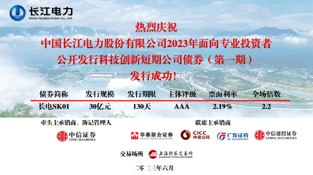 6月8日,长江电力顺利完成2023年第一期科技创新短期公司债簿记建档工作,发行规模30亿元,期限130天,票面利率为2.19%。本次发行获得市场投资者广泛参与和踊跃认购,6月12日,本期债券募集资金到账,标志着此项发行工作圆满完成。