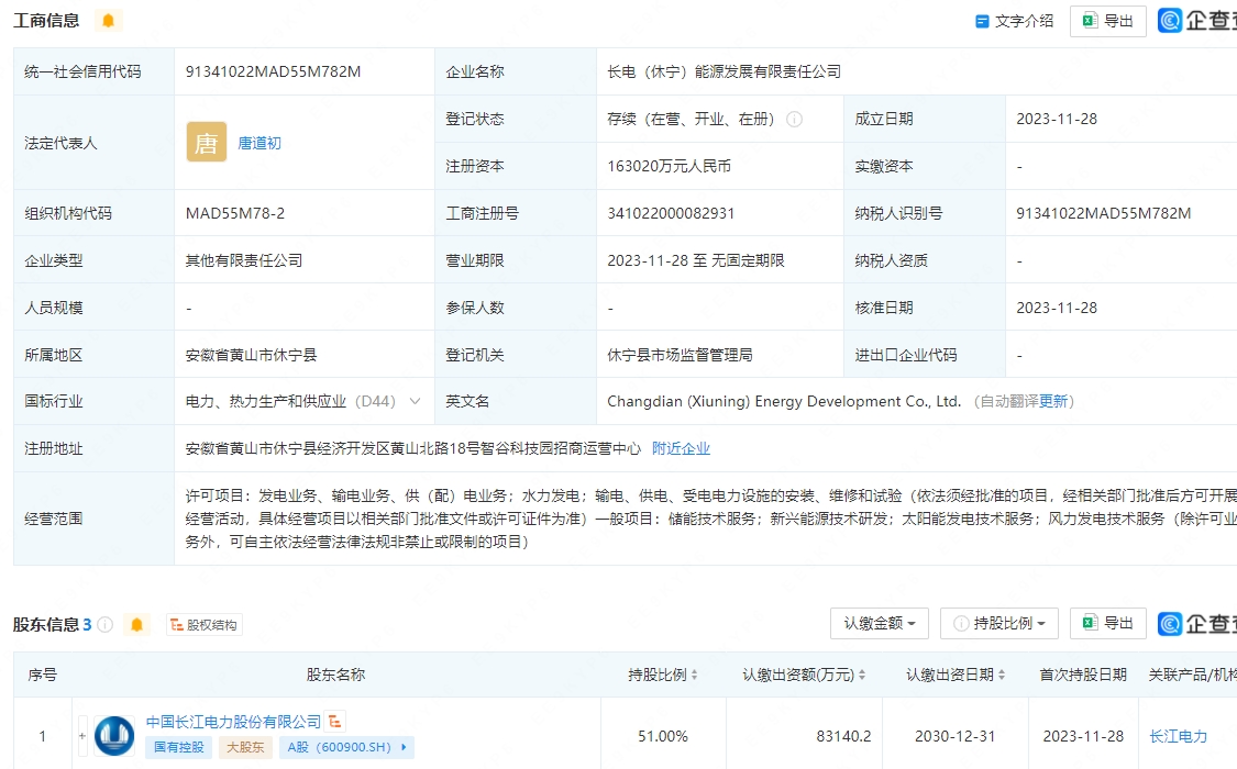 近日,长电(休宁)能源发展有限责任公司成立,法定代表人为唐道初,注册资本16.3亿元,经营范围包含:储能技术服务;新兴能源技术研发;太阳能发电技术服务;风力发电技术服务等。 权穿透显示,该公司由长江电力等共同持股。(每日经济新闻)