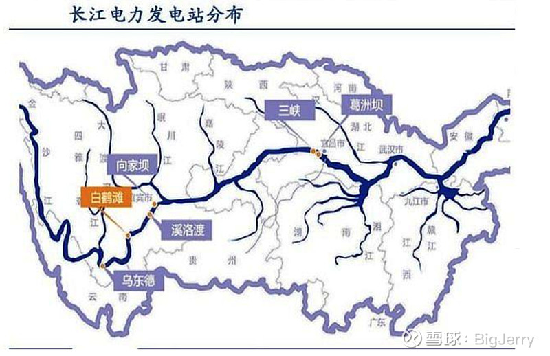 长江电力的核心竞争力在于独特的地理位置,铸就了中国最便宜的清洁能源来源,看一下长电六座水电站(得天独厚的地理位置)的分布: