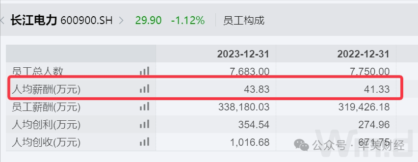 截至去年末,长江电力员工总数7683人,去年人均创利超过354万元,人均薪酬近44万元,比2022年增加大约2万元。