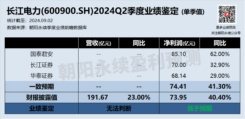长江电力第二季度单季营收和净利润分别同比增长23.0%和40.4%,根据朝阳永续A股盈利预测数据,公司实际净利润略低于市场预期。