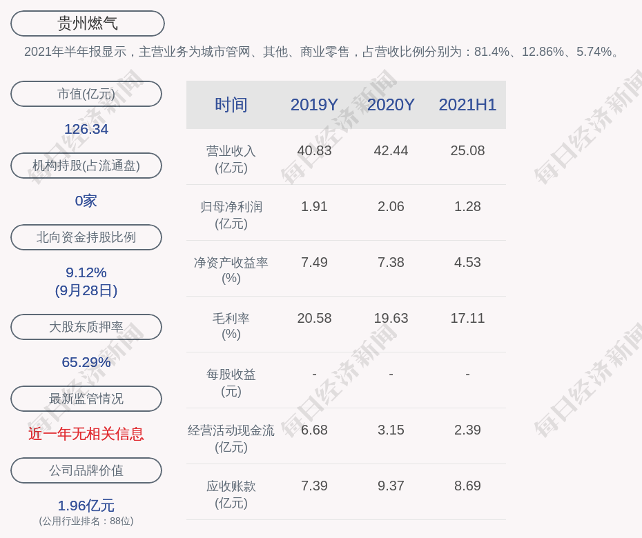 2021年半年报显示,贵州燃气的主营业务为城市管网、其他、商业零售,占营收比例分别为:81.4%、12.86%、5.74%。