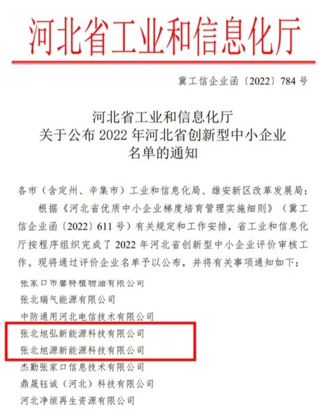 近日,河北省工业和信息化厅公布了2022年河北省创新型中小企业名单,三峡能源河北张北旭弘、旭源新能源科技有限公司顺利通过评审,荣获河北省创新型中小企业荣誉称号。