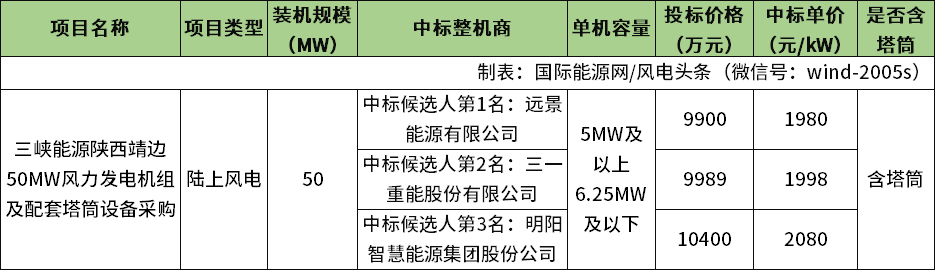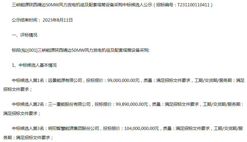 8月8日,三峡能源陕西靖边50MW风力发电机组及配套塔筒设备采购中标候选人公示,远景能源、三一重能、明阳智能3家整机商入围。