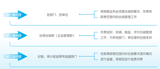 当前,三峡能源建立“三道防线”,用以健全合规管理组织体系;举办“合规管理强化年”活动,从“总法谈合规”、“《民法典》专栏”、“投资并购培训月”等多个角度,对员工进行合规培训。