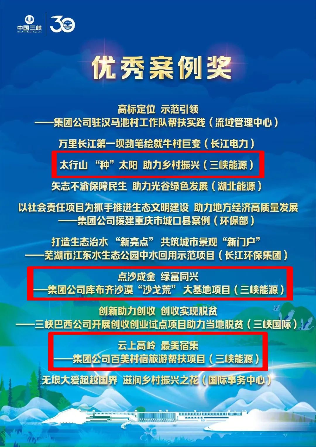 近日,三峡集团2023年社会责任优秀案例和优秀短视频评选结果揭晓,三峡能源报送的《太行山“种”太阳助力乡村振兴》《点沙成金绿富同兴》《云上高岭最美宿集》分别荣获“优秀案例奖”、《渔光曲》荣获“优秀短视频奖”,三峡能源荣获“优秀组织奖”。