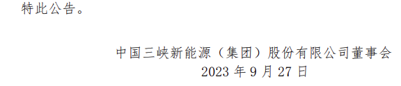 9月27日,三峡能源发布《中国三峡新能源(集团)股份有限公司2023年1-8月发电量完成情况公告》。