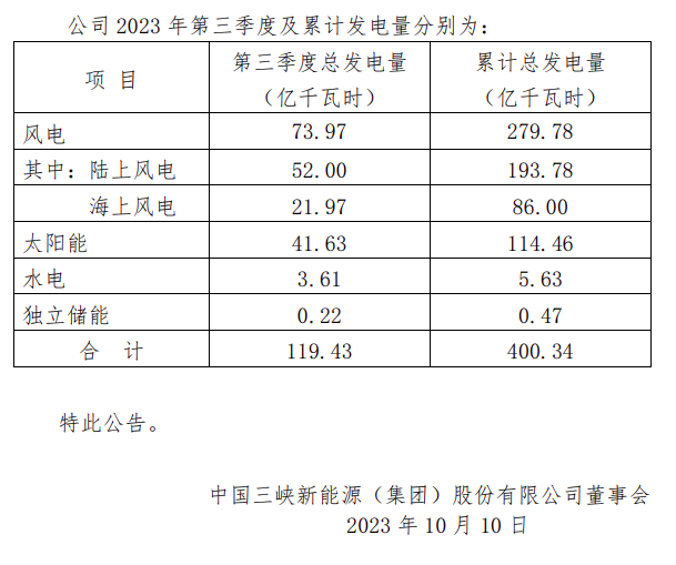 10月10日,三峡能源发布《2023年第三季度发电量完成情况公告》。