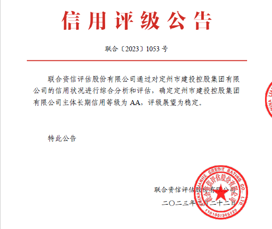 近日,定州市建投控股集团有限公司(以下简称“定州建投集团”)获得联合资信评估股份有限公司给予的AA主体长期信用等级,评级展望为稳定。定州建投集团成为定州市首家AA主体评级企业,综合实力在河北省区县国有企业中名列前茅。