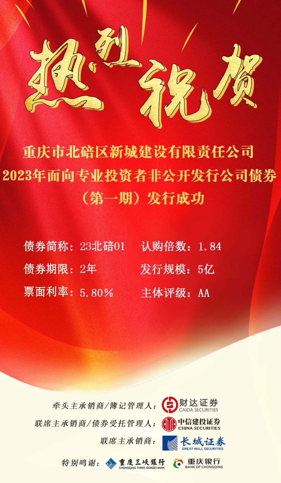 3月30日,由公司担任牵头主承销商的重庆市北碚区新城建设有限责任公司(简称“新城公司”)2023年面向专业投资者非公开发行公司债券第一期(以下简称“本期债券”)成功发行。本期债券发行规模5.00亿元,期限为2年,发行人主体评级AA,票面利率5.80%,创重庆市近三年来同级别同资质同期限私募公司债票面利率新低。
