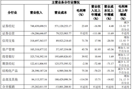 主营业务分行业来看,证券经纪实现营收7.48亿元,同比减少16.90%,毛利率23.69%,比上年减少15.62个百分点;证券自营实现营收-5420.66万元,同比减少111.08%;信用交易实现营收3.19亿元,同比增长17.98%,毛利率71.78%,比上年增加13.65个百分点;资产管理实现营收1.05亿元,同比增长81.95%,毛利率45.78%,比上年增加5.44个百分点;投资银行实现营收3.26亿元,同比增长10.44%,毛利率39.92%,比上年增加5.17个百分点;期货经纪实现营收1.22亿元,同比减少72.40%,毛利率-2.58%,比上年减少4.37个百分点;结构化产品实现营收2839.02万元,同比减少70.23%,毛利率75.38%,比上年减少9.56个百分点;总部及其他实现营收8411.56万元,同比增长15.71%,毛利率-114.50%,比上年增加74.17个百分点。