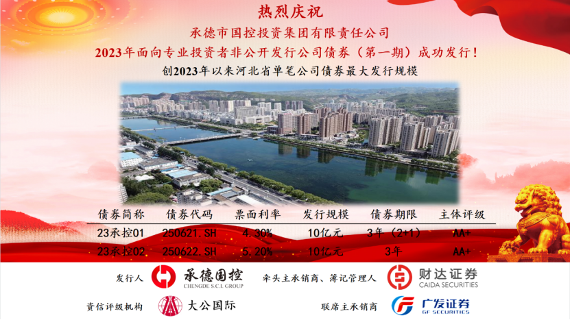 4月19日,承德市国控投资集团有限责任公司2023年面向专业投资者非公开发行公司债券(第一期)成功发行。本期债券发行规模为20亿元,创河北省2023年以来单笔公司债券最大发行规模。