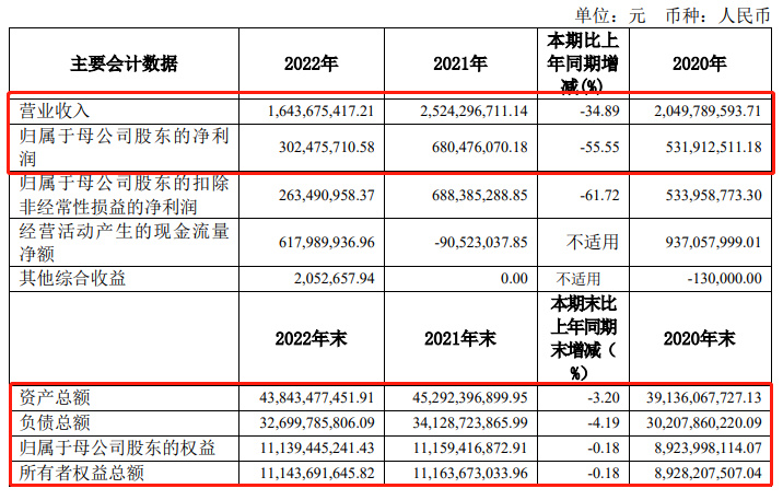 2022年,公司实现营业收入16.44亿元,较上年同期减少8.81亿元,同比下降34.89%;归属于母公司股东的净利润3.02亿元,较上年同期减少3.78亿元,同比下降55.55%。