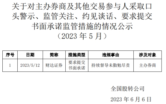 中国经济网北京6月6日讯全国中小企业股份转让系统网站今日公布的关于对主办券商及其他交易参与人采取口头警示、监管关注、约见谈话、要求提交书面承诺监管措施的情况公示显示,2023年5月12日,财达证券持续督导未勤勉尽责,全国股转公司对其要求提交书面承诺。