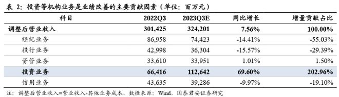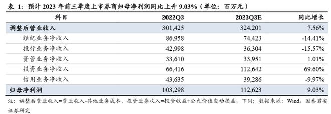 国泰君安证券研报便预计,2023年前三季度上市券商业绩整体呈增长态势,其中归母净利润同比上升9.03%,与此同时投资等机构业务是业绩改善的主要贡献因素。